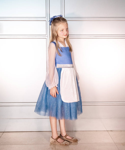 Let your little one step into the magical world of Beauty and the Beast with our Belle-inspired village dress. This delightful dress draws inspiration from Belle's charming blue outfit, seen in the beginning of the beloved story when she strolls through her village, engrossed in her favorite book. Crafted from soft stretch blue fabric, this dress ensures both comfort and elegance for your little princess. The classic white apron adds a touch of timeless charm, while the silver stretch belt provides a perfect, princess-worthy fit. The skirt is a vision of layered enchantment, featuring multiple tiers of sparkly blue tulle that shimmer and shine with every step.